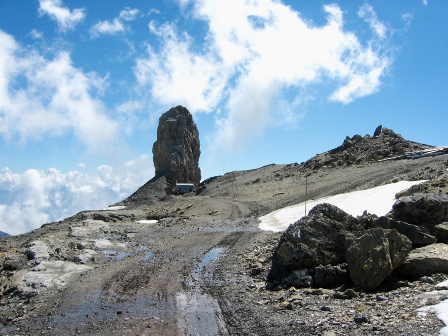 | Vom Sanetschpass aus erstreckt sich auf linker Hand die Schratte mit dem Turm der Quille du Diable, rechts der Gletscher von Tsanfleuron. Im Vordergrund sieht man erste Felder von erodiertem Kalk - hier beginnt das weitläufige Schrattengebiet. | ||||